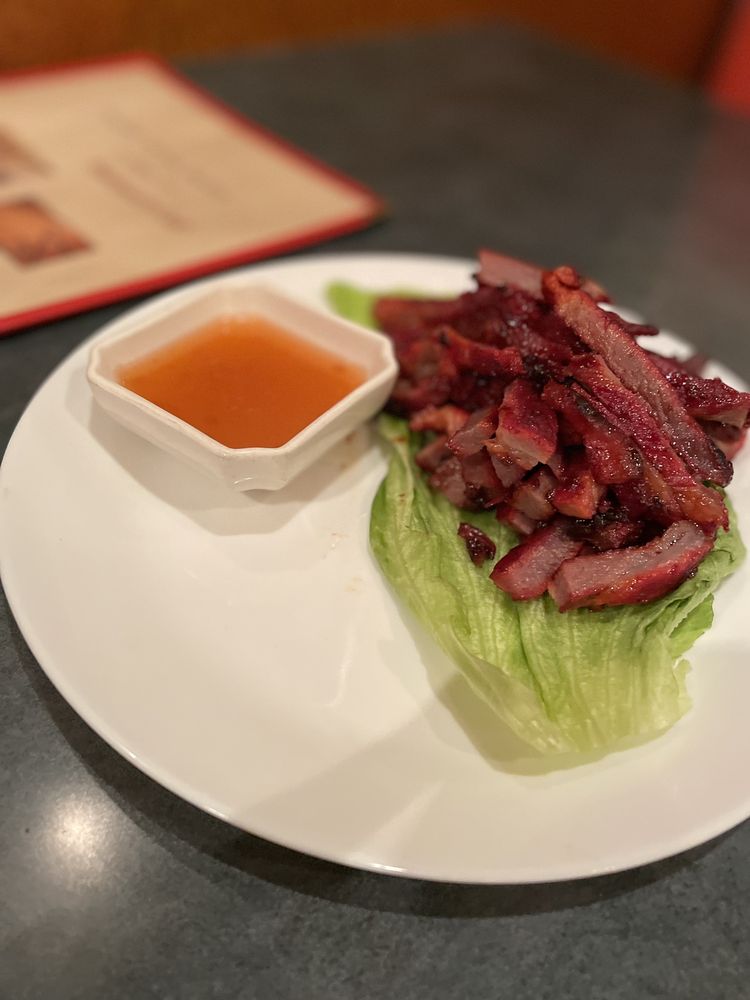 Diced chicken stir-fried in a brown sauce, served with lettuce leaf cups and pine nuts.