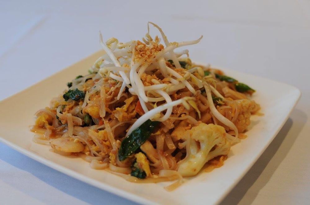 Stir rice vermicelli, with shrimp, chicken, tofu, bell peppers, eggs, onions and ground peanuts in chef special spicy sauce.